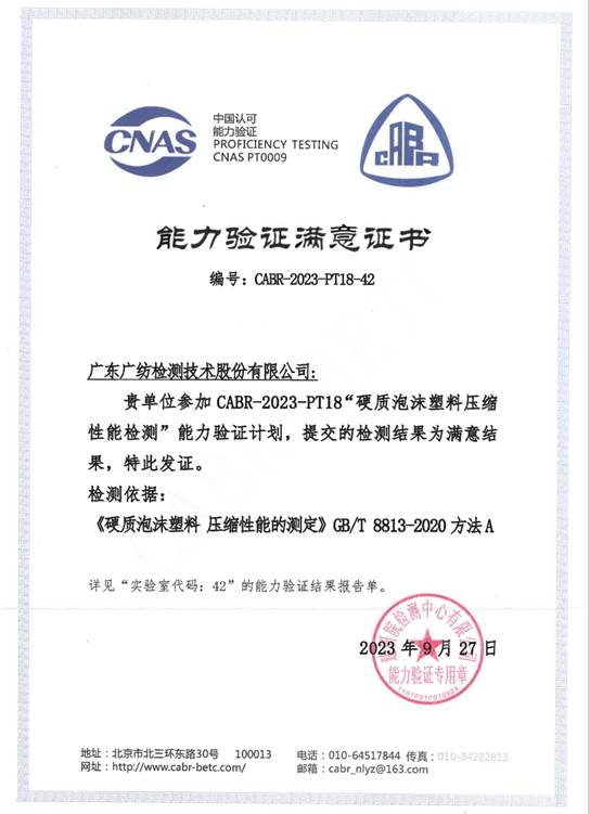 近日,广东广纺检测技术股份有限公司收到国家建筑工程质量检验检测中心(建研院检测中心有限公司)组织的“硬质泡沫塑料压缩性能的测定”能力验证结果满意证书。